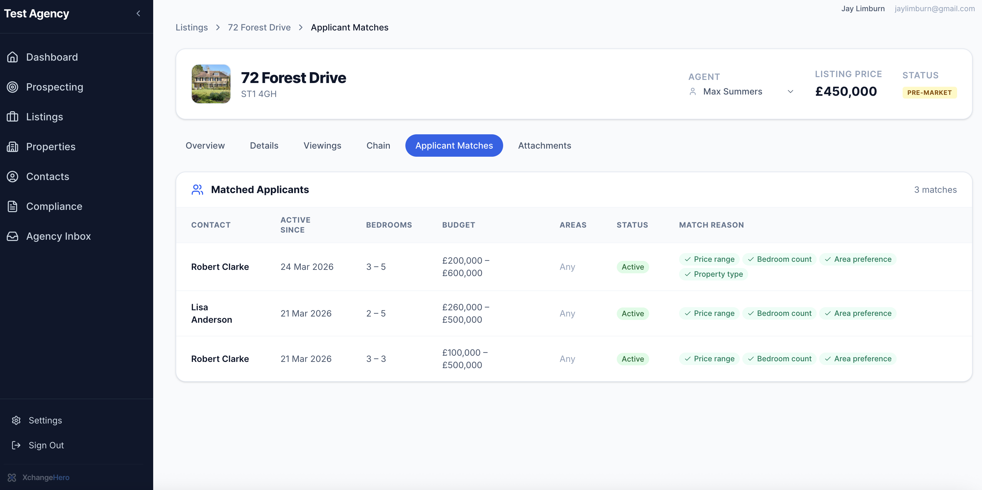 Every listing has an Applicant Matches tab. The moment a property is added — at any stage — XchangeHero checks it against every active applicant profile and shows you who matches, and why.